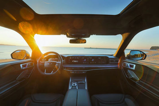 与此同时,全新探险者采用5层夹胶前挡玻璃,主副驾双层隔音玻璃,全车97个聚氨酯密封降噪胶块,不受窗外嘈杂影响,配合B&O音响,让座舱成为了可移动的海边豪华音乐厅;搭配1.1㎡超大天窗,仿佛置身豪华游艇上的阳光甲板,向前看是海阔,抬头看是天空,高级质感不言而喻。