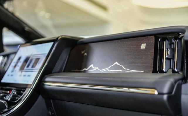往前,合鸣。副驾驶饰板精选北美黑胡桃木,嵌入云山白鹭合鸣而飞的和谐景象,寓意家人、朋友或合作伙伴,和谐惬意。往后,重山。座椅精选半苯胺高级真皮,绘制云山重重景象,寓意家庭、朋友宛如重山的坚实后盾,做事业闯天下更有底气。往右,归舟。二排门饰板营造“兴尽晚回舟”山水画卷,寓意无论人往何方,都有平安归家的舒适。