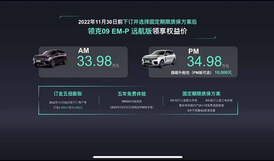 2022年11月30日前下订并选择固定期限质保方案后,领克09 EM-P远航版AM领享权益价为33.98万元,领克09 EM-P远航版PM领享权益价为34.98万元。