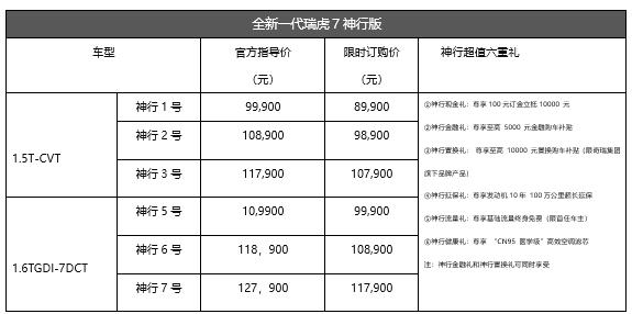 9月24日,奇瑞汽车旗下全新一代瑞虎7神行版正式在辽宁区域上市。此次新车发布包括1.6T+7DCT和1.5T+CVT两种动力组合,共6款车型,官方指导价为9.99-12.79万元。为了向广大消费者提供更高质价比的驾享体验,奇瑞汽车特推出神行超值六重礼。11月30日前100元订金立抵10000元,1.5T神行版车型限时订购价低至8.99万元起,1.6T神行版车型限时订购价低至9.99万元起!同时,还可享受神行金融礼、神行置换礼、神行延保礼等多重礼遇。