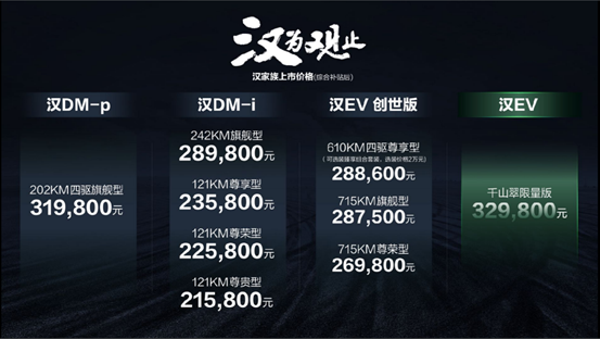 此次,产品实力全面进阶的汉家族4款车型,综合补贴后售价区间为21.58-32.98万元,同时为用户准备了2大无忧购车政策、1大无忧用车保障、5大专属贵宾服务、5大智联在线服务等多重购车礼遇。