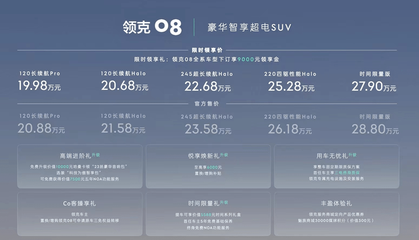 9月8日,豪华智享超电SUV领克08于北京正式上市,本次共推出5款车型:120长续航Pro售价20.88万元、120长续航Halo售价21.58万元、245超长续航Halo售价23.58万元、220四驱性能Halo售价26.18万元、时间限量版28.80万元。