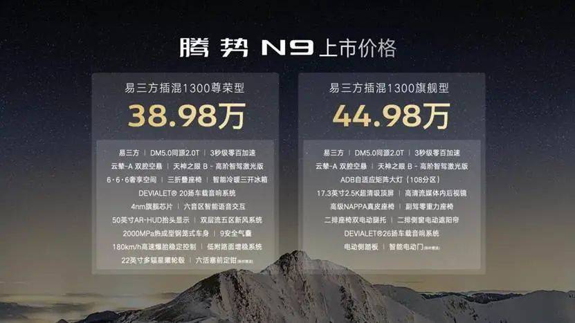 3月21日,科技安全全能旗舰SUV腾势N9震撼上市不再低调,以科技致敬奋斗者时代。推出易三方插混1300尊荣型、易三方插混1300旗舰型,官方指导价38.98万元—44.98万元。科技重构旗舰SUV,腾势N9全系标配易三方、2.0T超级混动、云辇-A(双腔空气悬架)、天神之眼 B,重塑50万级大型旗舰SUV价值标杆,开启科技豪华SUV新纪元。