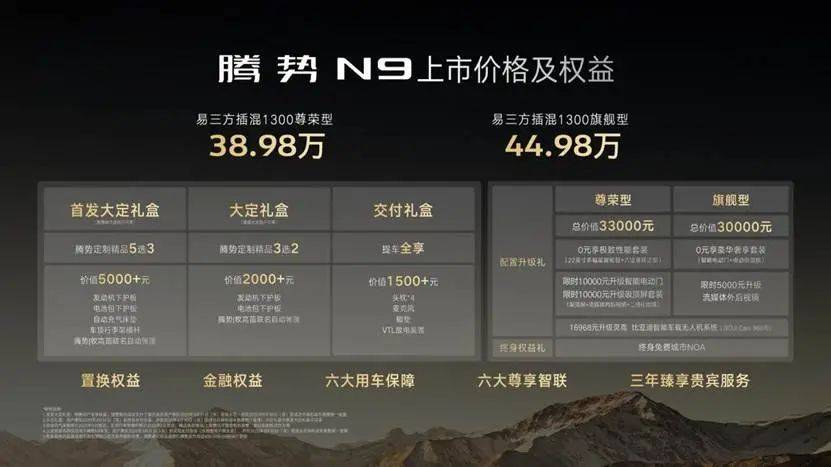 为感谢预售用户的信赖,腾势N9特别推出限定礼遇:预售转大定用户可享价值5000+元首发大定礼盒;直接大定用户可享价值2000+元大定礼盒。所有提车用户皆可享价值1500+元交付礼盒,诚意拉满!此外,腾势N9还重磅推出16968元升级灵鸢·比亚迪智能车载无人机系统、终身免费城市NOA、至高10000元置换补贴、12期0息等六大上市权益。