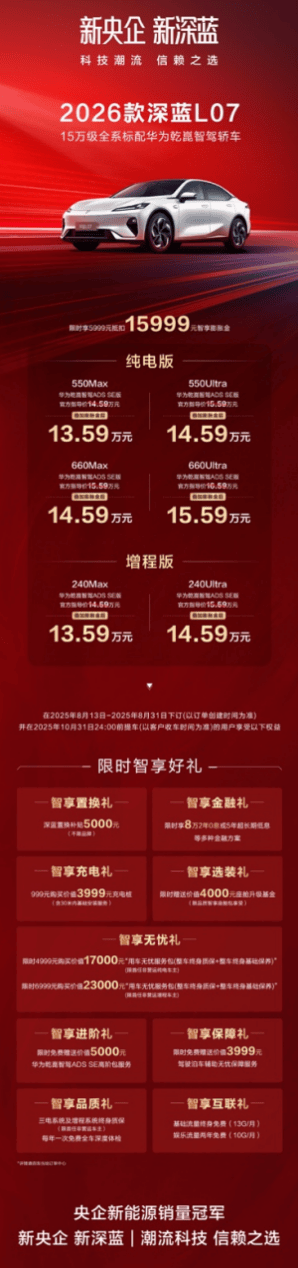 8月13日,15万级唯一全系标配华为乾崑智驾轿车——2026款深蓝L07焕新上市,共推出6个版本,售价区间为13.59-15.59万元。新车不仅全系标配华为乾崑智驾ADS SE,还采用进化升级的深蓝超级增程2.0,并凭借科技美学、新智舱、新驾乘等全维越级实力,成为新能源轿车市场的新焦点。
