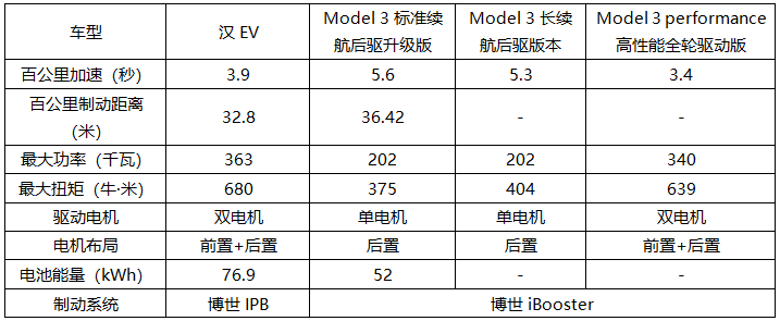 汉EV百公里制动距离32.8米得益于博世IPB智能集成系统,建立制动压力的速度更快,是其他产品的3-4倍。特斯拉Model 3采用博世iBooster机电伺服制动系统,虽同样出自博世,但IPB是博世最新的产品,无论是制动距离、舒适度,还是续航能力上,都不如汉EV采用IPB智能集成制动系统。