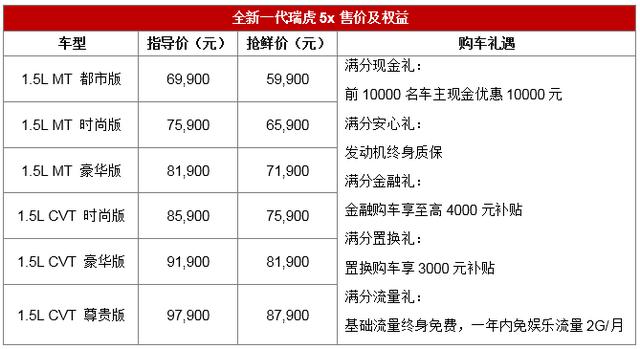 7月18日,在北国重镇,美丽的沈阳,奇瑞全新一代瑞虎5x正式上市。新车提供1.5L MT/CVT两种动力总成共6款车型,官方售价区间为6.99-9.79万元,前10000名车主优先畅享现金优惠10000元,抢鲜价5.99万元起。同时,奇瑞汽车还郑重承诺:全新一代瑞虎5x发动机终身质保,成为A0级SUV市场第一个,也是唯一一个提供发动机终身质保的车型。此外,新车还提供满分金融礼、满分置换礼、满分流量礼。