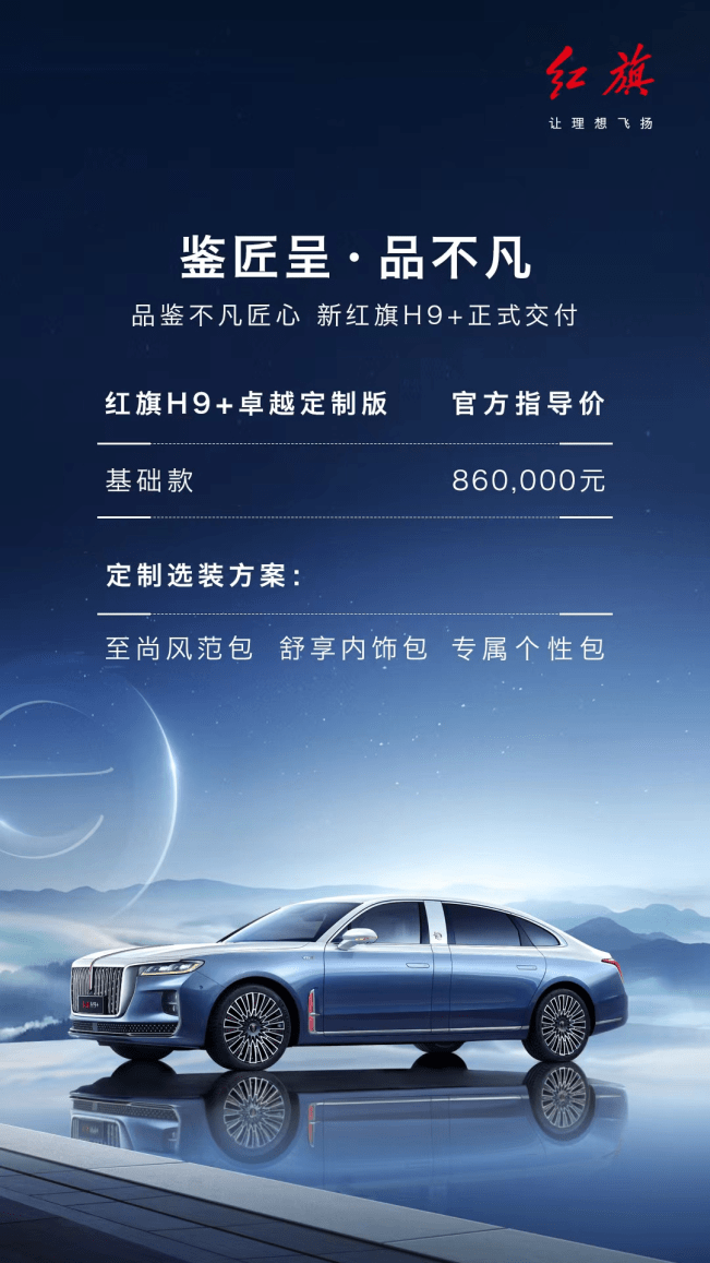 创新中国品牌,传承中国文化,匠呈至臻体验。随着走向更多用户身边,新红旗H9+将进一步成为“中国式新高尚精致主义”理念的扛鼎力作,以中国传统文化和东方极致美学的深度融合、凝聚科技与匠心的再次升华,带给用户极具东方气韵的专属至尊享受。礼遇匠呈、久久欣祥,新红旗将一如既往地投入到助力民族汽车工业腾飞的征程中,继续打造引领行业的优秀产品、持续推动品牌向上发展,实现更多中国用户的美好出行梦想!